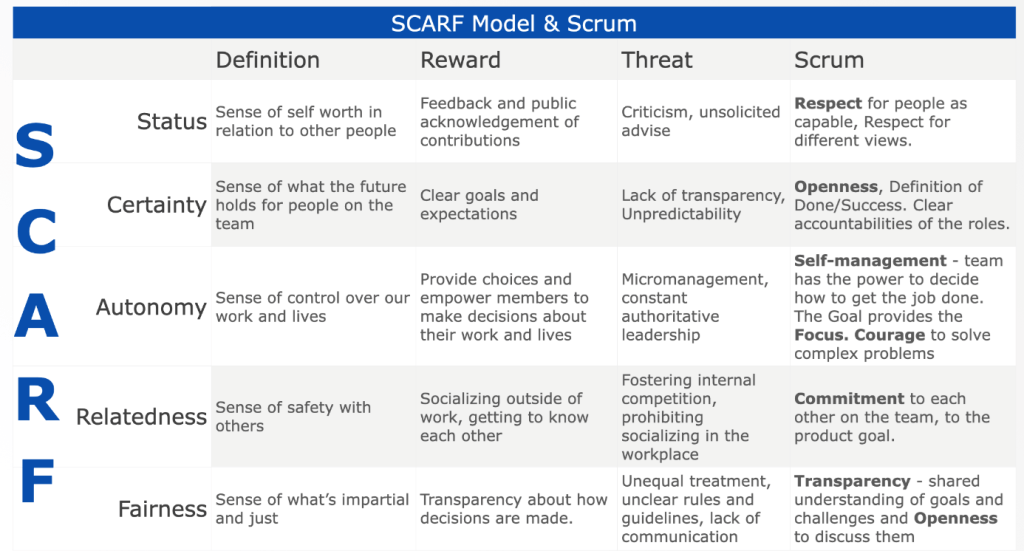 Zoals eerder vermeld is de mate van individuele coaching beperkt. Wel kunnen we de SCARF basis behoeften linken met de Scrum values. Ik heb een afbeelding bijgevoegd van Itopa Sulé die in zijn blog SCARF en Scrum heeft vergeleken.