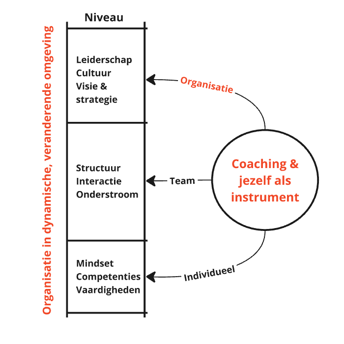 - Individueel niveau: Coaching, training, mentoring en begeleiding van individuele medewerkers en teamleden.